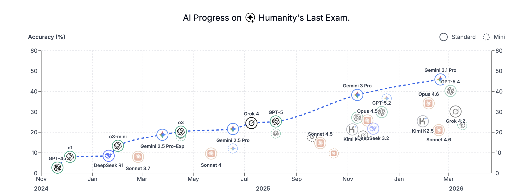 Humanity’s Last Exam, a multi-modal benchmark at the frontier of human knowledge, designed to be the final closed-ended academic benchmark of its kind with broad subject coverage. The dataset consists of 2,500 challenging questions across over a hundred subjects. They publicly release these questions, while maintaining a private test set of held out questions to assess model overfitting. ↩