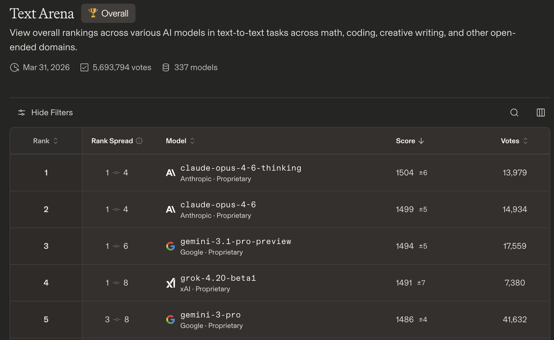 On Arena (formerly LMArena), where real users vote on two anonymous models across whatever tasks they actually care about, Gemini has two models in the top five in the Text Arena. More than any other company. Claude leads the leaderboard; Gemini trails narrowly.