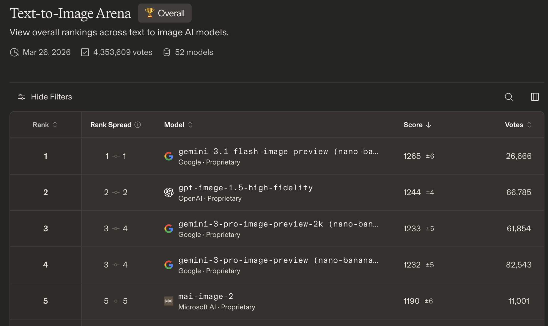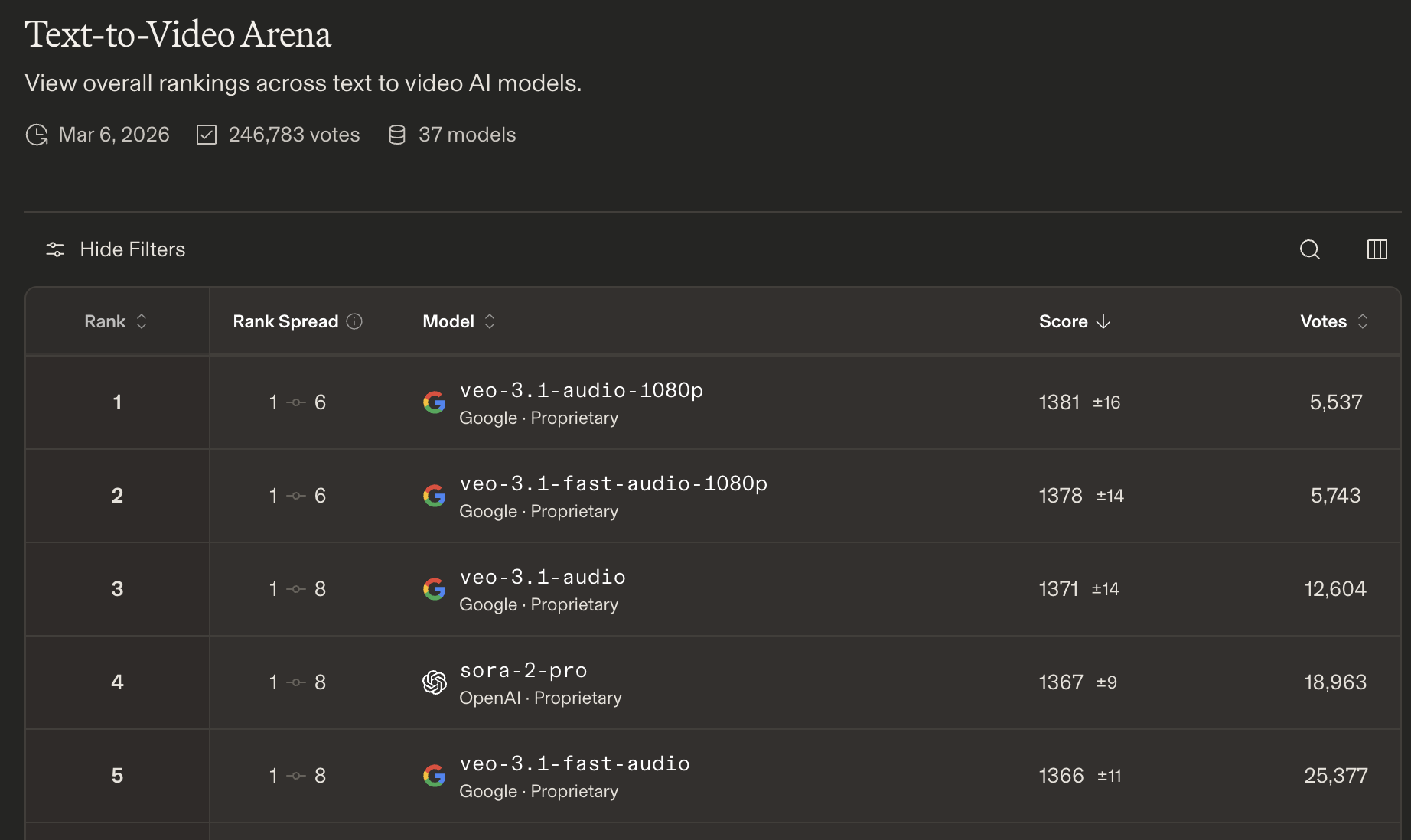 On Text-to-Image and Text-to-Video Arena, Google is dominant with Gemini and Veo taking most of the positions.